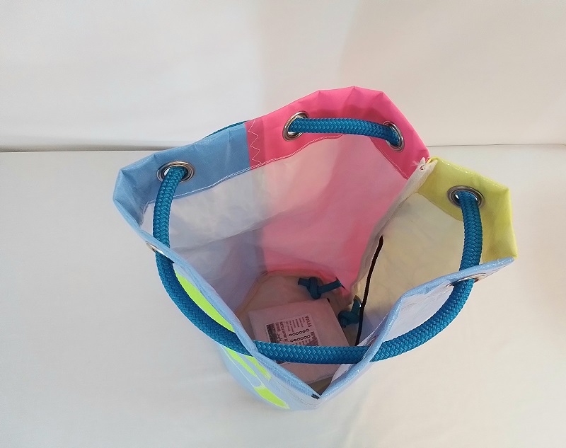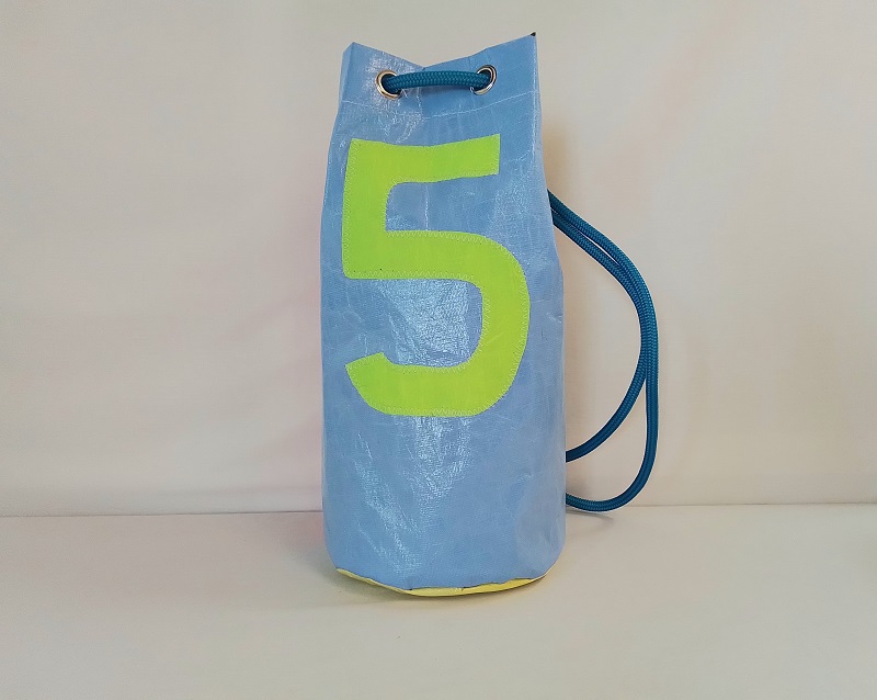Sac baluchonHauteur 50cm, Diamètre fond 24cmMatériaux recyclés : Corps en voile de Char à voileDoublure en dacronN° en Insigna sur une face cousu en zig-zag Anse en corde, passée dans des œillets pour port à l'épaule ou en sac à dosFermeture par une attache coulissantePoche intérieure en dacron ...En savoir plus