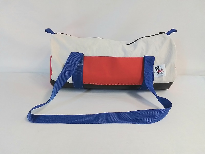 Petit sac skipper ou sac week-endDimensions : Longueur 52 cm, diamètre 27 cm.Matériaux recyclés : Corps en dacron et toile d'ombrage, doublé en dacron, fond en peau de zodiac2 anses larges de 4cmFermeture éclair équipée de tirettes à chaque extrémité.Poche frontale ouverte et une poche ouverte ...En savoir plus