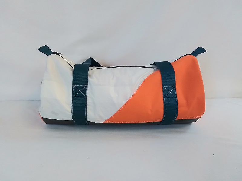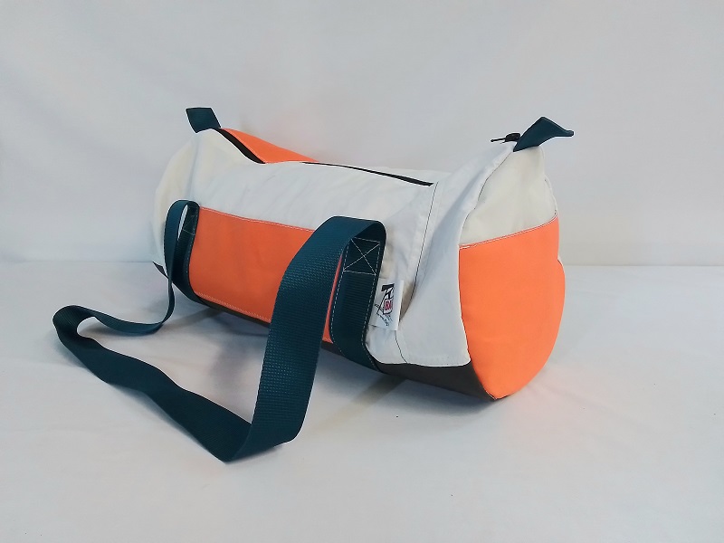 Petit sac skipper ou sac week-endDimensions : Longueur 52 cm, diamètre 27 cm.Matériaux recyclés : Corps en dacron et toile d'ombrage, doublé en dacron, fond en peau de zodiac2 anses larges de 4cmFermeture éclair équipée de tirettes à chaque extrémité.Poche frontale ouverte et une poche ouverte ...En savoir plus